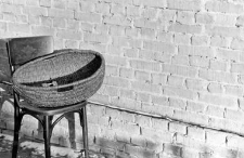 In the photo a chair standing under a brick wall ; a wicker basket on the chair. Its a kind of basket oval in shape and without a handle, used in farming for loose products (grain, chaff, forage, tailings). Woven from wicker.